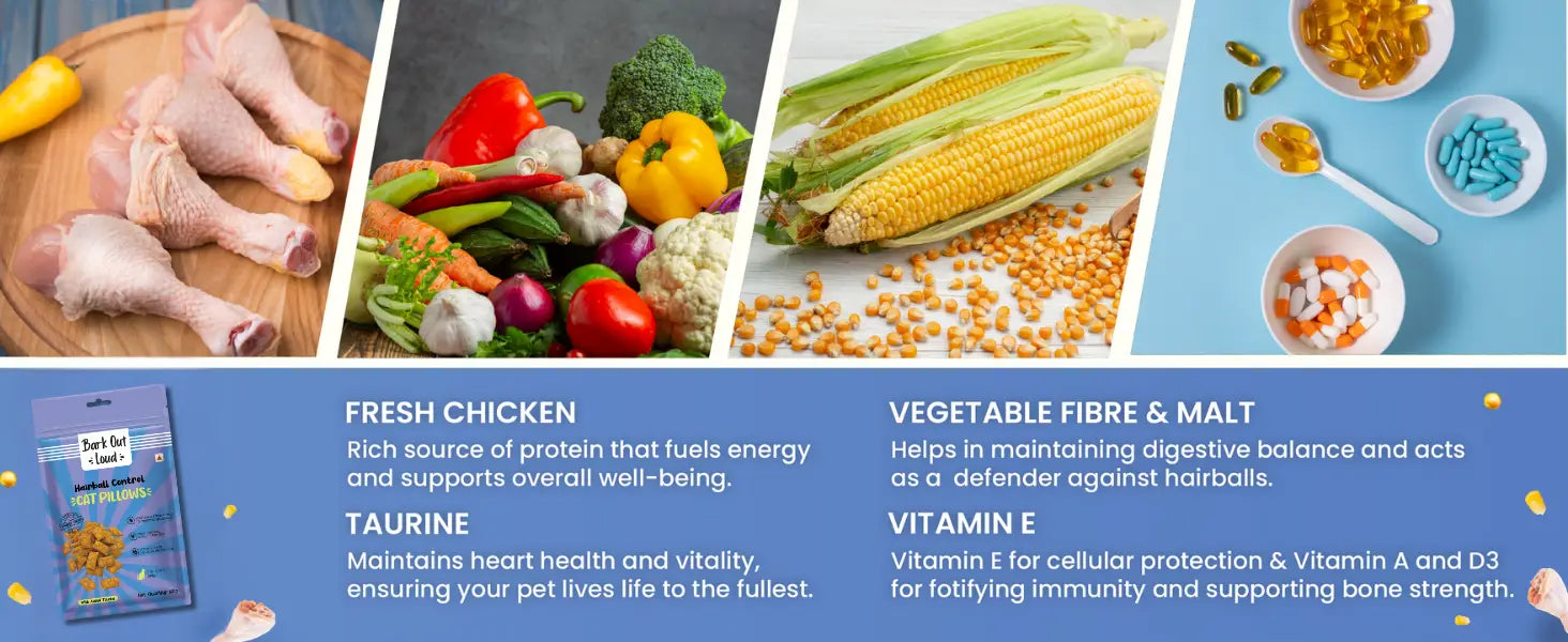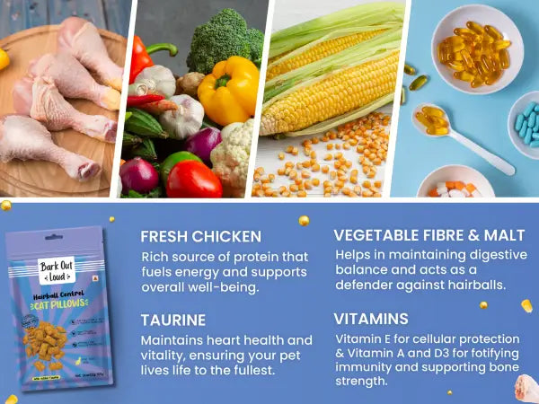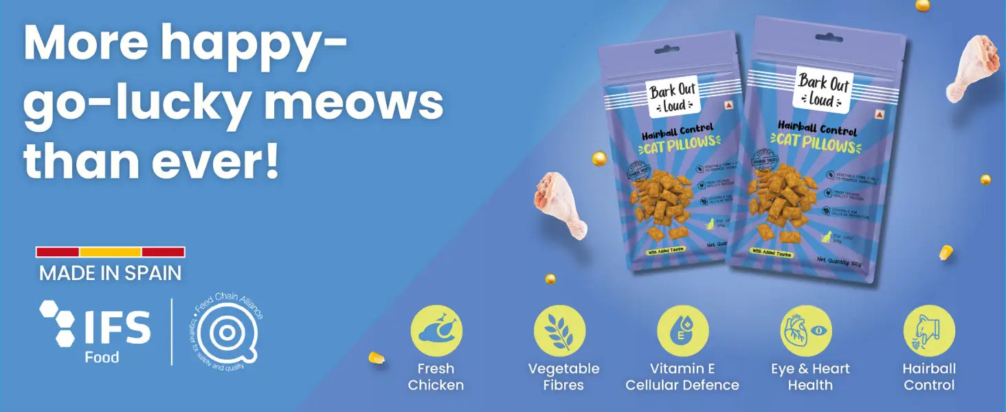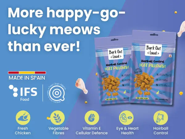 Bark Out Loud Cat Pillows are fresh, protein-rich treats with fresh chicken and taurine that make your cats go hairball free. They also contain vegetable fiber and malt for minimising hairballs.