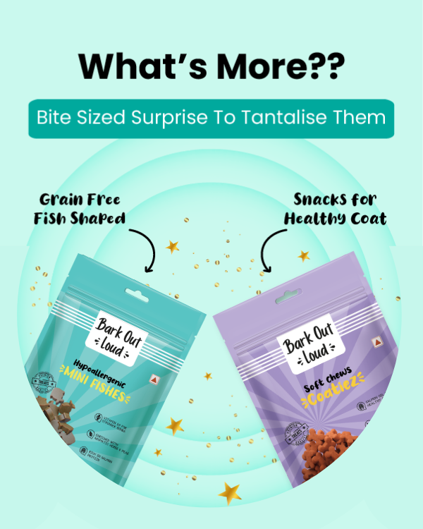 Mini Fishes - Hypoallergenic treats that are protein-rich and made with salmon, peas, aromatic herbs and also biotin.
